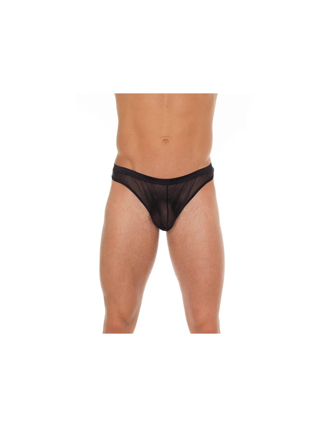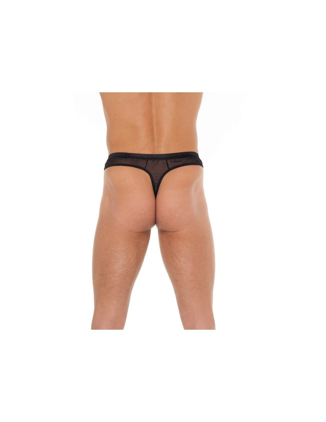 Deze string voor mannen is geheel gemaakt van een transparante zwarte stof.