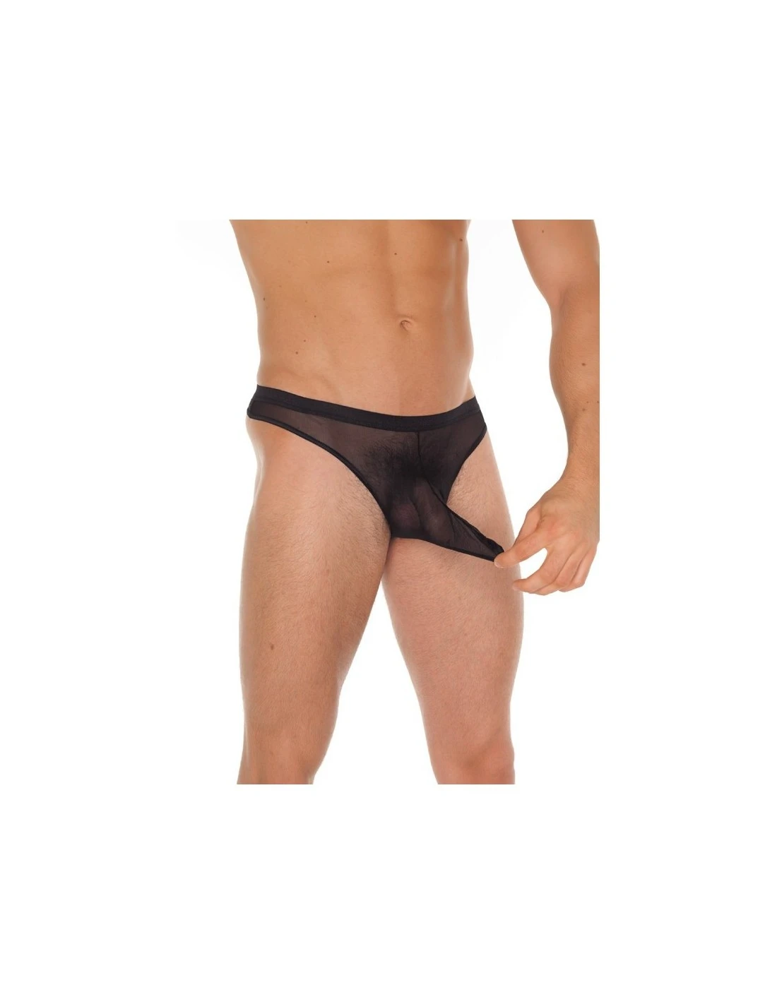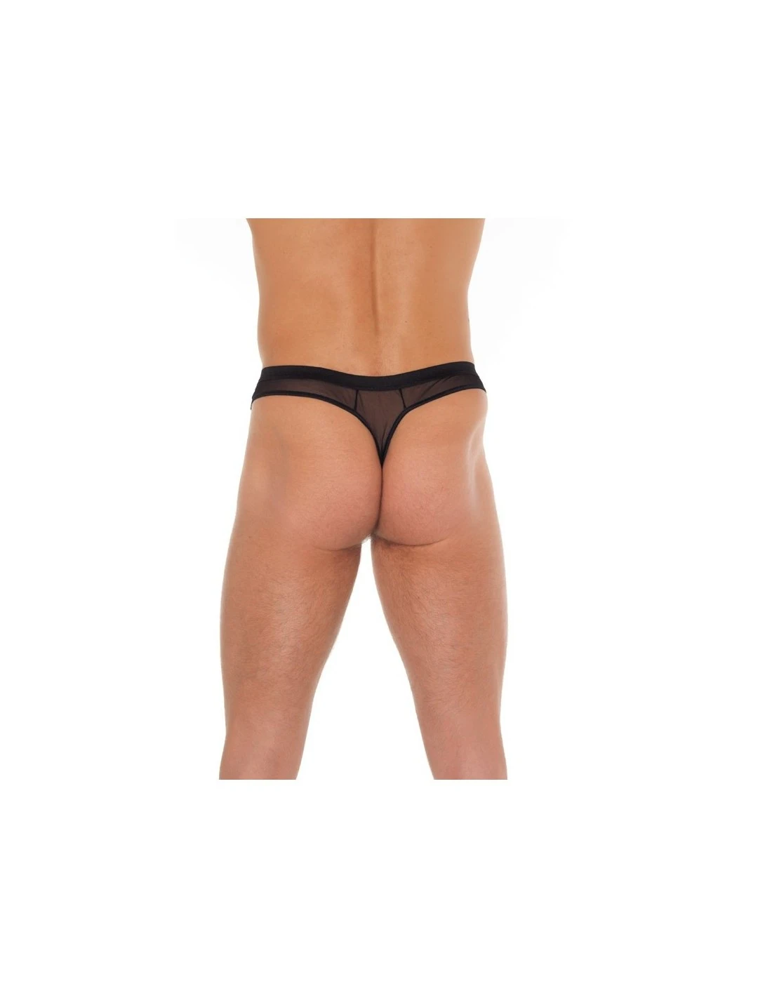 Deze string voor mannen is geheel gemaakt van een transparante zwarte stof en heeft een verlenging zodat je penis stijver kan worden in je string.