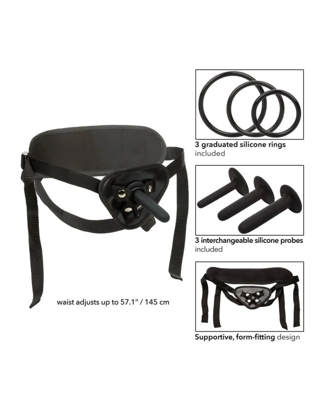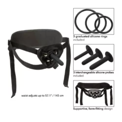 Verander eenvoudig de maat van de sonde met de set van 3 verwisselbare harnasringen voor elke dong, dildo of Boundless harnasspeeltje. Blijf comfortabel, zelfs tijdens het meest intense plezierspel met de universele pasvorm, volledig verstelbare dij- en heupbanden en ondersteunende rugband.