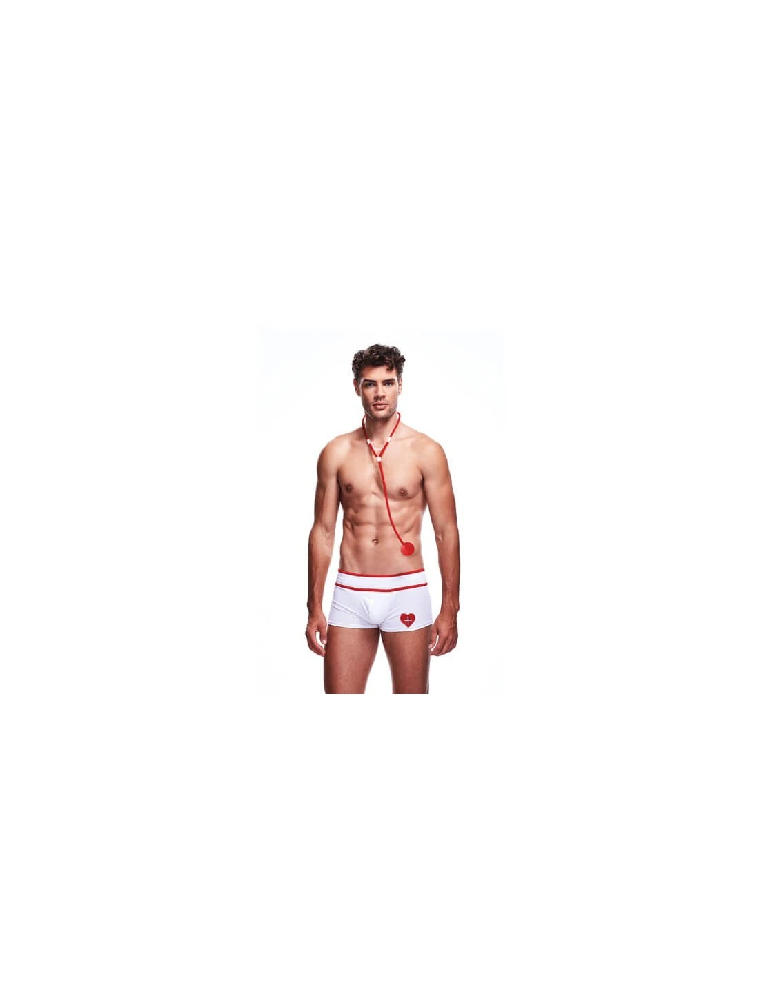 Dit speelse en super sexy tweedelige kostuum bestaat uit een witte lowrise boxershort met rode accenten en een bijpassende rode stethoscoop wat de look compleet maakt voor de ultieme fantasie!