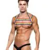 Het nieuwste aanbod van ENVY Menswear combineert een eenvoudige maar ondersteunende zwarte string (klassiek!) met een borststuk met bandjes in regenboogthema.