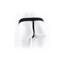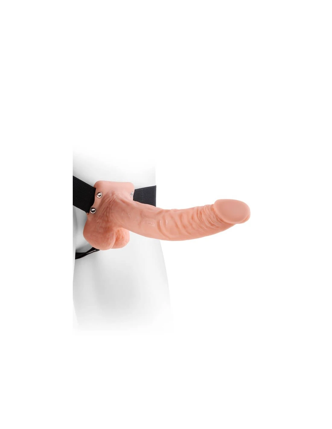 De dildo is hol vanbinnen, waardoor hij gedragen kan worden door zowel mannen als vrouwen.