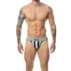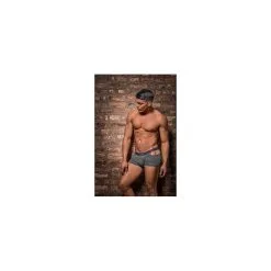 Deze stijl, uit de Heather Haze-collectie van Male Power, omvat: een minishort met uitgesneden vensters op de heupen en achterkant, een pluche fel elastiek, decoratief stikselaccent en een sportieve pluche tailleband met merklogo.