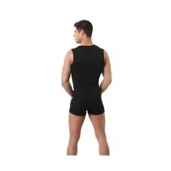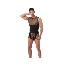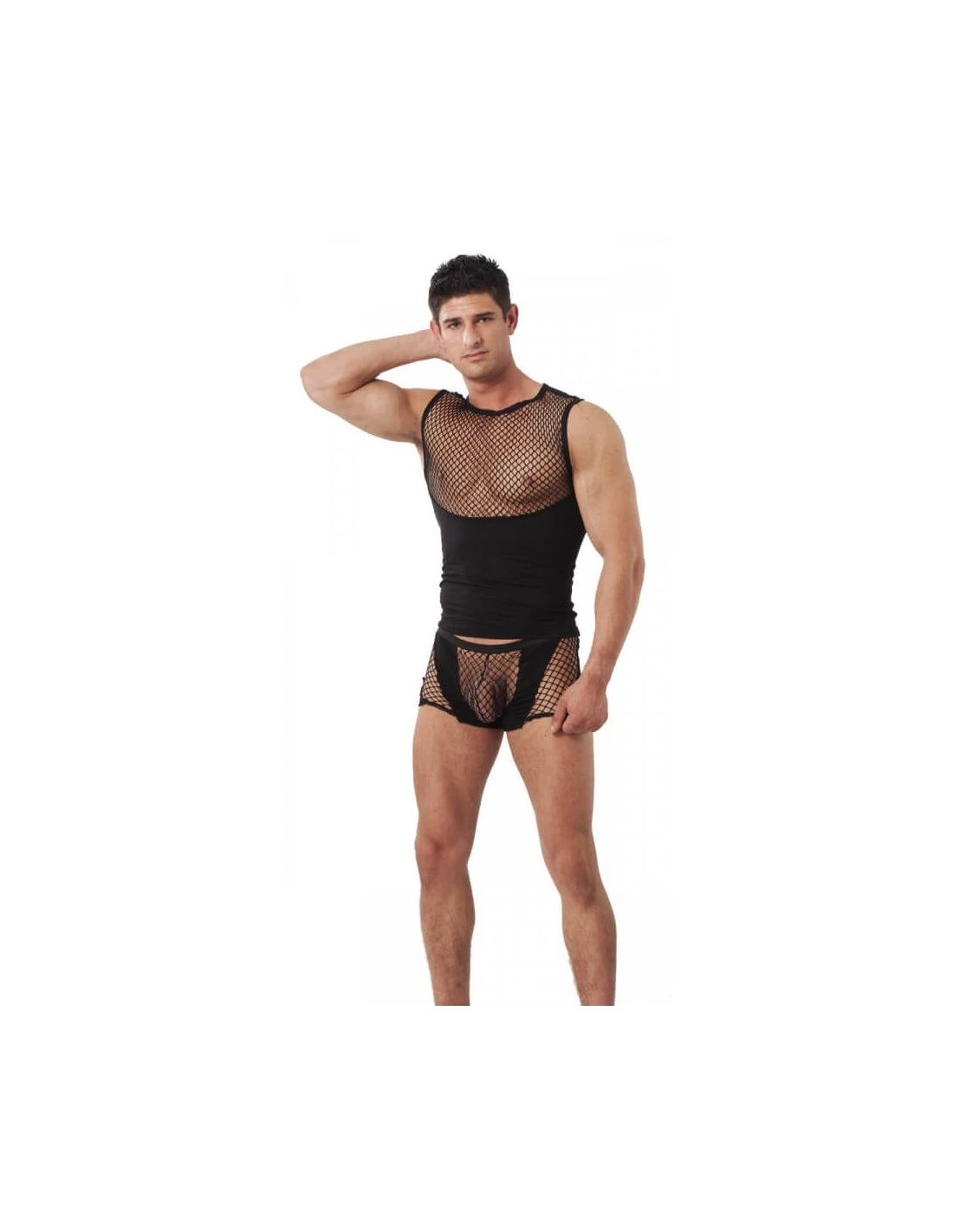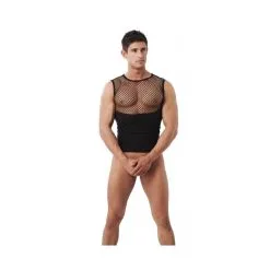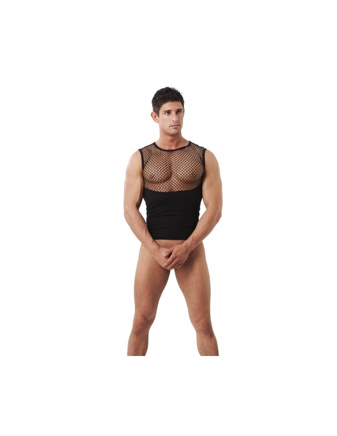 De achterkant van het shirt is geheel gesloten en de voorkant is voor de helft bewerkt met een netstof.