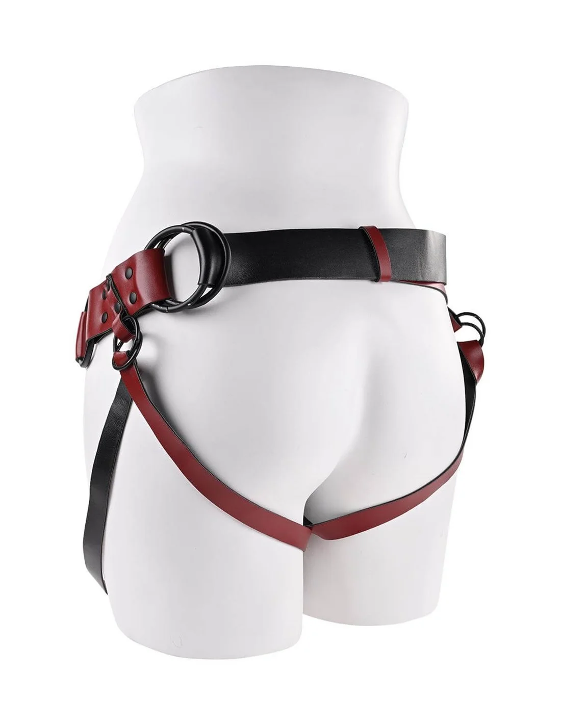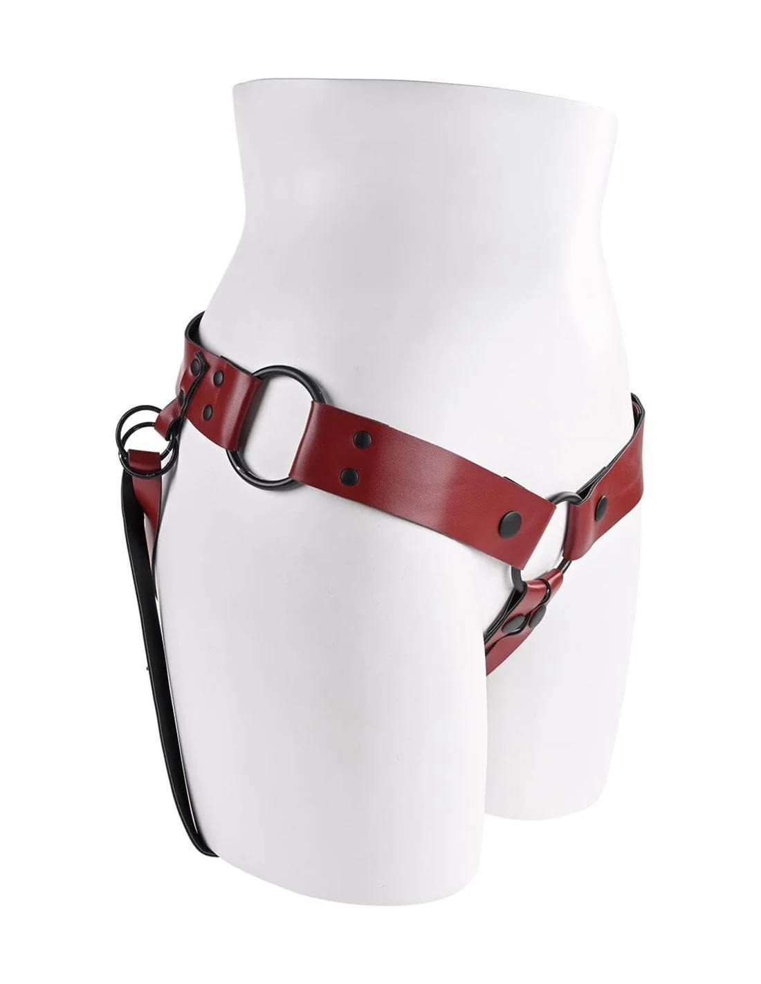 Helder scharlaken imitatieleer met gepolijste zwarte gespen maakt dit een statement stuk dat wacht op je favoriete speeltje. Voeg een stevige of holle dildo toe en begin je volgende scène.
