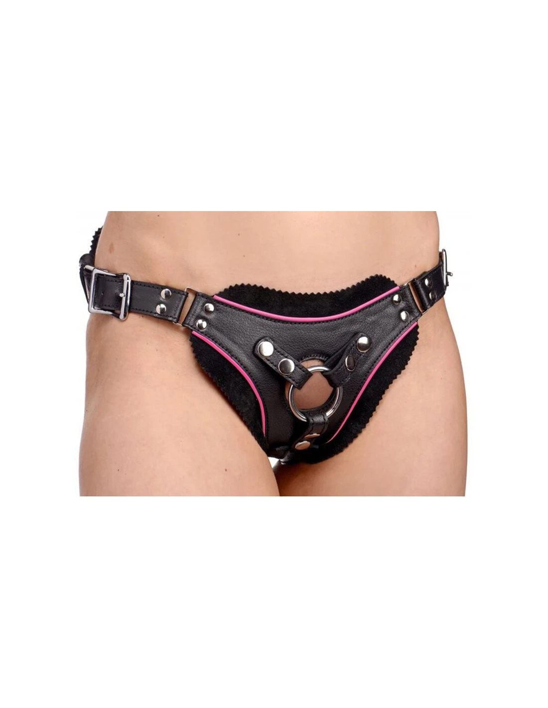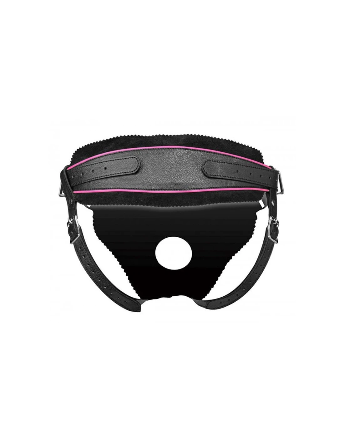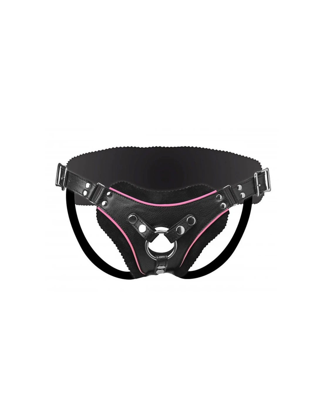 Dit strap-on harnas, dat geschikt is voor veganisten, is voorzien van leuke roze accenten en is laag uitgesneden, zodat je de aandacht trekt en alle ogen op jou gericht zullen blijven.