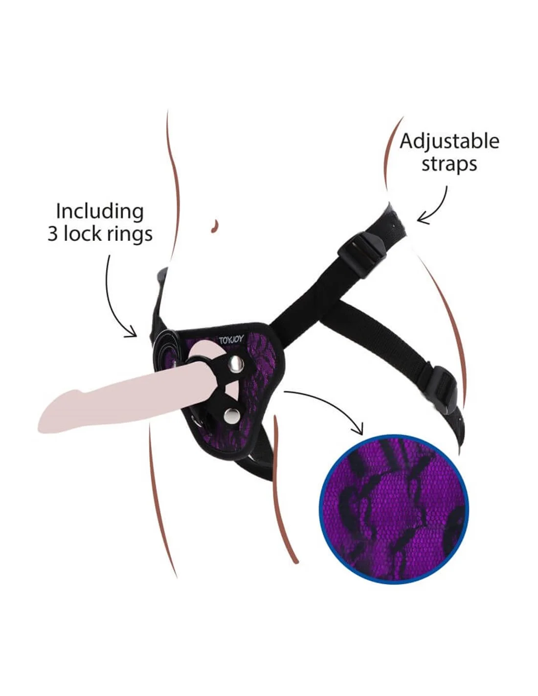 Het voorste deel is ontworpen met verstelbare sluitingen. Inclusief 3 siliconen ringen (3,5 & 4,5 en 5 cm) waarmee je je favoriete dildo kunt gebruiken.