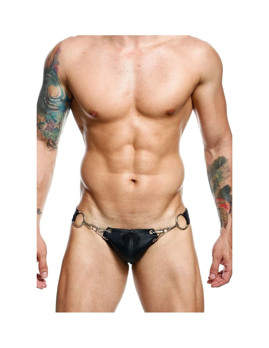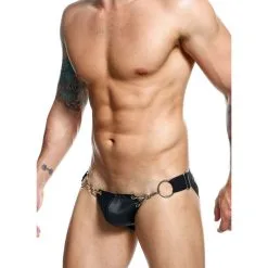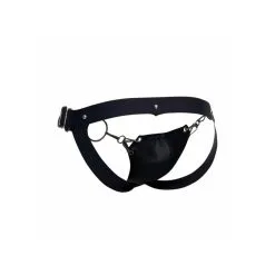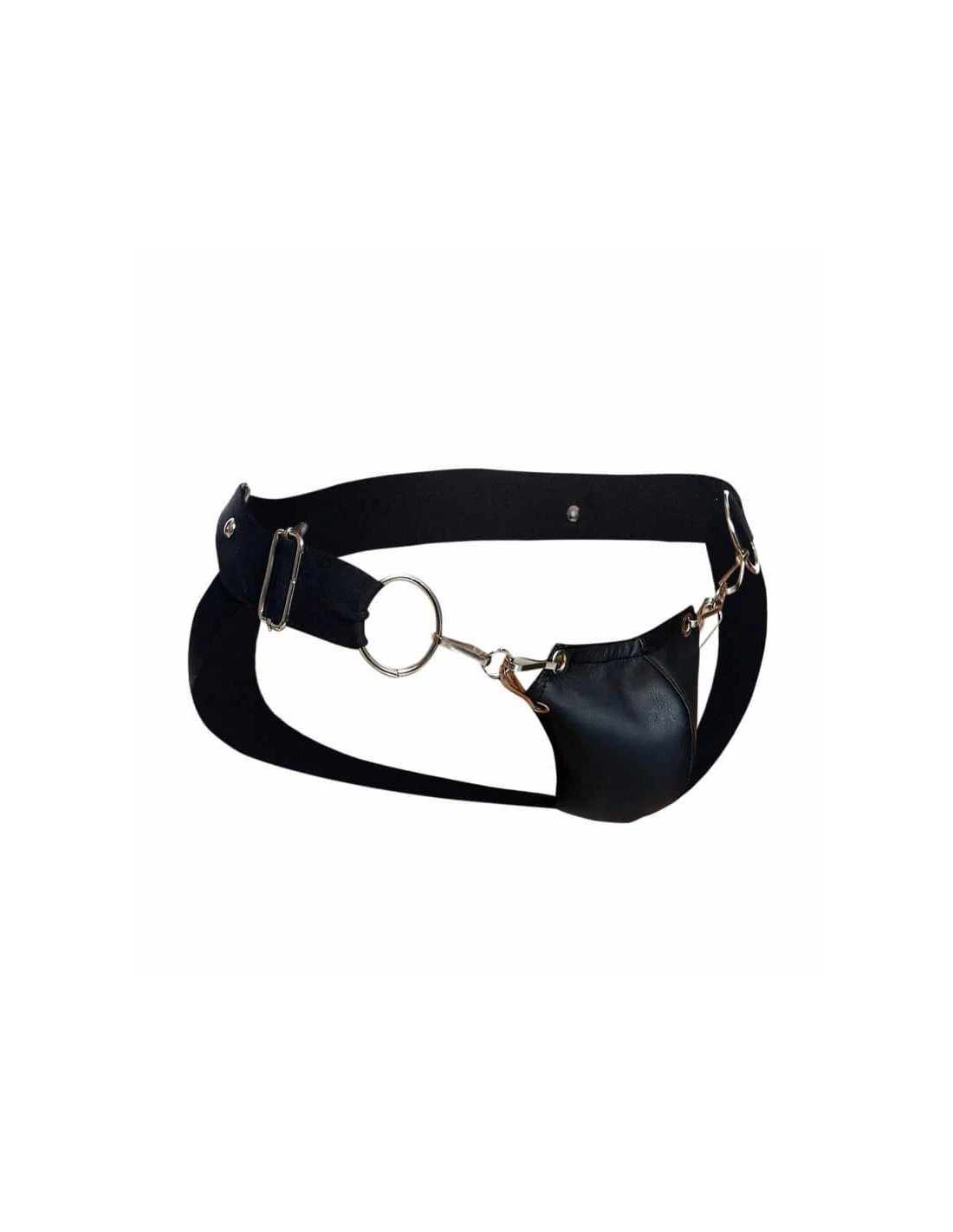 Een zakje met ketting aan de voorkant ondersteunt de penis zonder in te boeten op sexappeal, terwijl brede banden op de heupen zitten voor een ondersteunende afwerking.